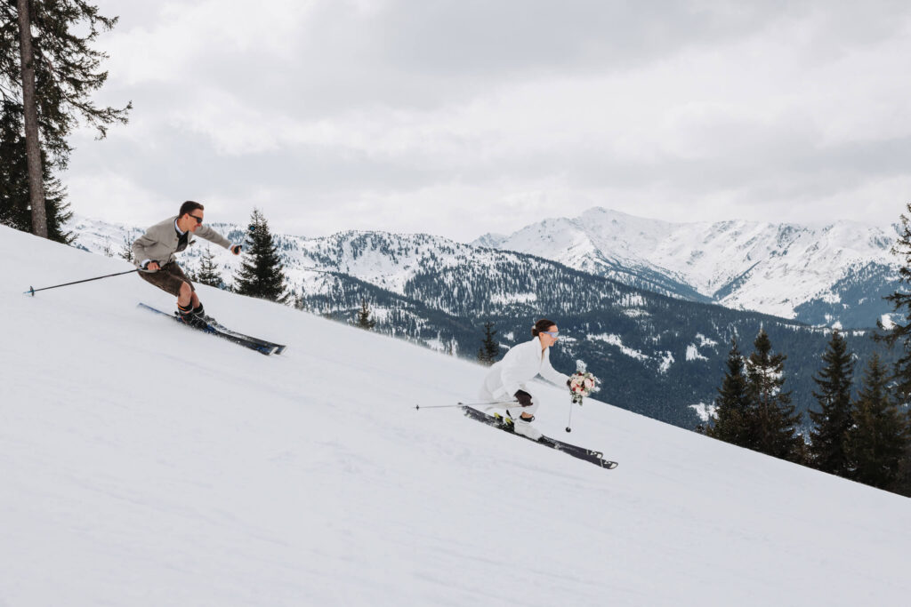 Ich habe ihre Geschichte erzählt – von ihrer ersten Begegnung bei einem Abendessen in Innsbruck über die gemeinsamen Skitage in leeren Pandemie-Gebieten bis hin zum Heiratsantrag in der Kristallhütte im Hochzillertal. Ihre Geschichte voller Berge, Abfahrten, gemeinsamem Kochen, Kaminfeuer-Küssen und Alliterationen, die sie leidenschaftlich gerne verwenden.