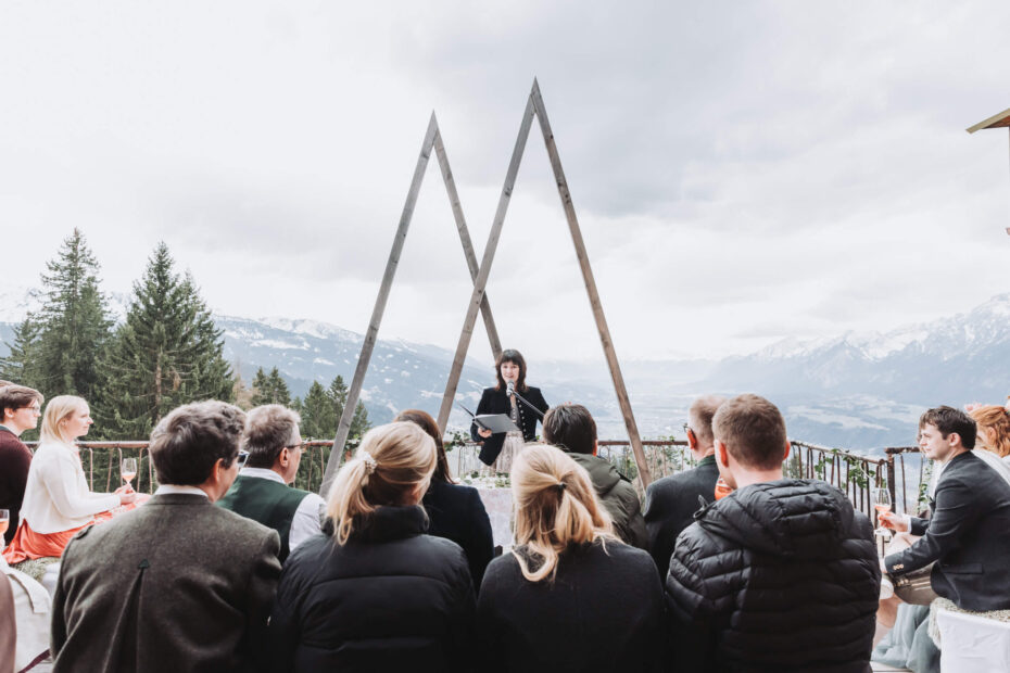 Auf der Panorama-Terrasse des Hotel Frieden, eingerahmt vom Zillertal und dem weiten Blick auf die Berge, heirateten Elena und Flo vor ihren liebsten Menschen.