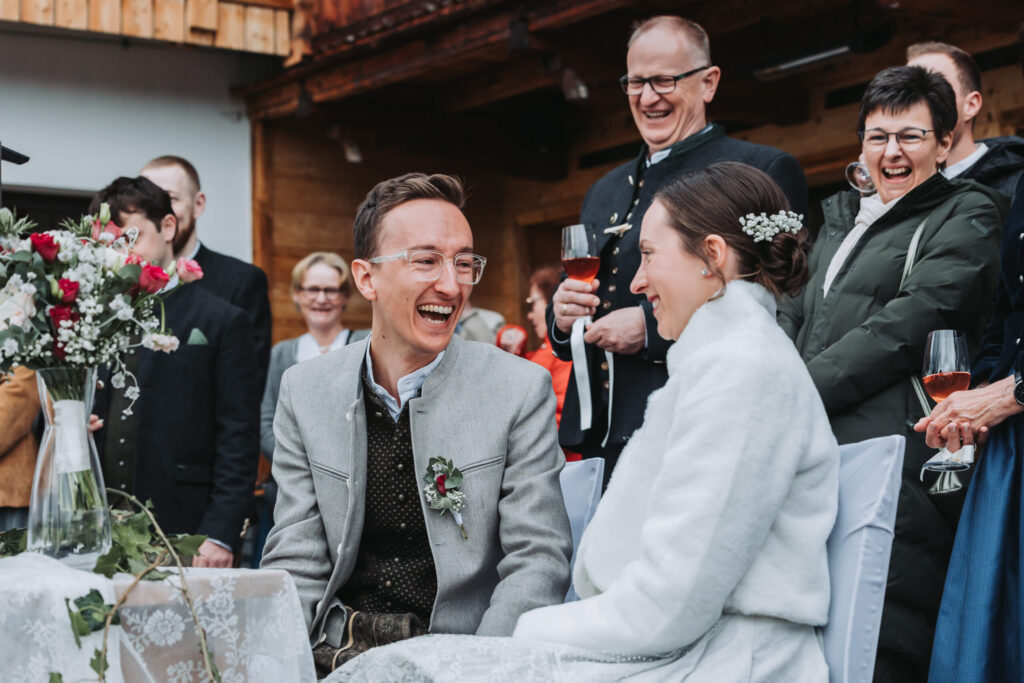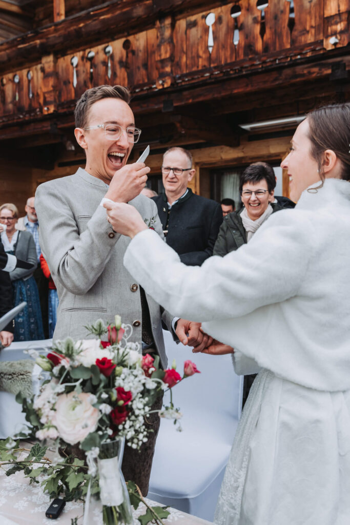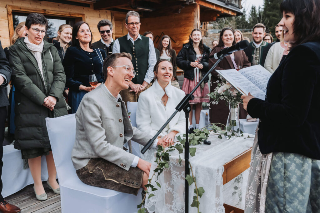 Danach der Hochzeitsabfahrt gab’s auf der Hütte ein Weißwurstfrühstück für den Gästen. Und erst dann kamen wir zur freien Trauung. Das ist kein Tagesprogramm. Das ist eine Lebenshaltung.