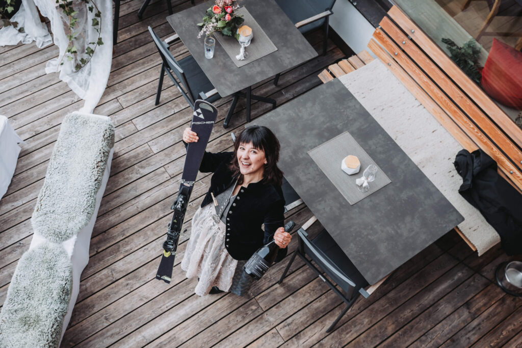 Ihr Hochzeitstag begann nicht mit Sektempfang und Smalltalk. Er begann mit Ski, Schnee und einer Hochzeitsabfahrt – Elena im Brautkleid, Flo in Lederhosen. Natürlich fotografiert von Sophia Eerden, die ich den beiden schon beim Kennenlerngespräch vor einem Jahr empfohlen hatte. Sophia hat sich auf Hochzeiten in den Bergen spezialisiert und passt einfach perfekt zu solchen Paaren – ich freue mich, wenn ich mit ihr zusammenarbeiten darf.