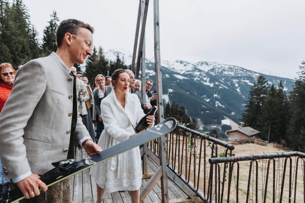 Elena hatte sich für das Ende der Trauung etwas Besonderes gewünscht: eine Sektflasche mit einem Ski aufzusäbeln. Natürlich haben wir das umgesetzt!